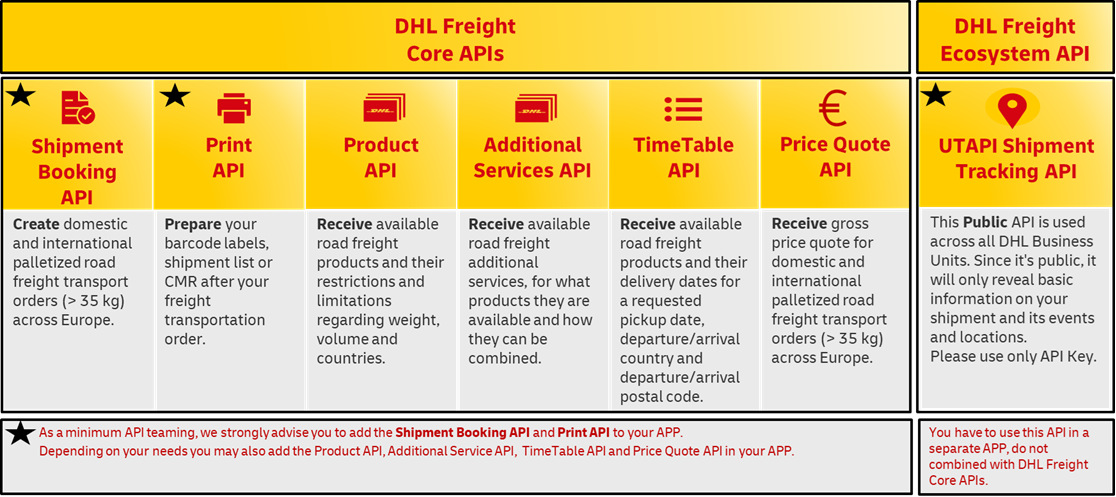 Each of below DHL Freight API has been described in more detail on the respective API Reference pages in below list